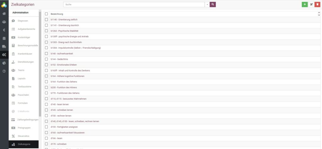Im Bereich der Administration können Sie ebenfalls für die Arbeit mit dem Terminkalender neue Zielkategorien und Dienstleistungen definieren. Standardmäßig sind bereits die wichtigsten Zielkategorien nach den bekannten ICF-Kapiteln hinterlegt. Auch Dienstleistungen außerhalb der ICF-Kapitel sind bereits hinterlegt.