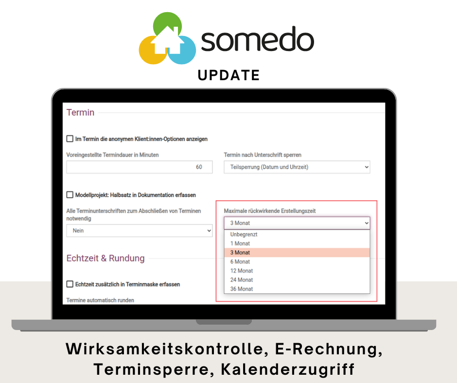 1. Layout Quittierungsbeleg: Flexibler bei noch nicht genehmigter Bewilligung In somedo wird für Klient:innen, deren neuer Bewilligungsbescheid noch aussteht, ein neuer (noch nicht bewilligter) Bewilligungszeitraum erstellt. Für die dazugehörigen Quittierungsbelege steht ab sofort ein neues Dropdown-Menü zur Verfügung: Ja: Stunden werden immer angezeigt – auch ohne aktuelle Bewilligung. Ja – nur bei bewilligtem Kontingent: Stunden […]