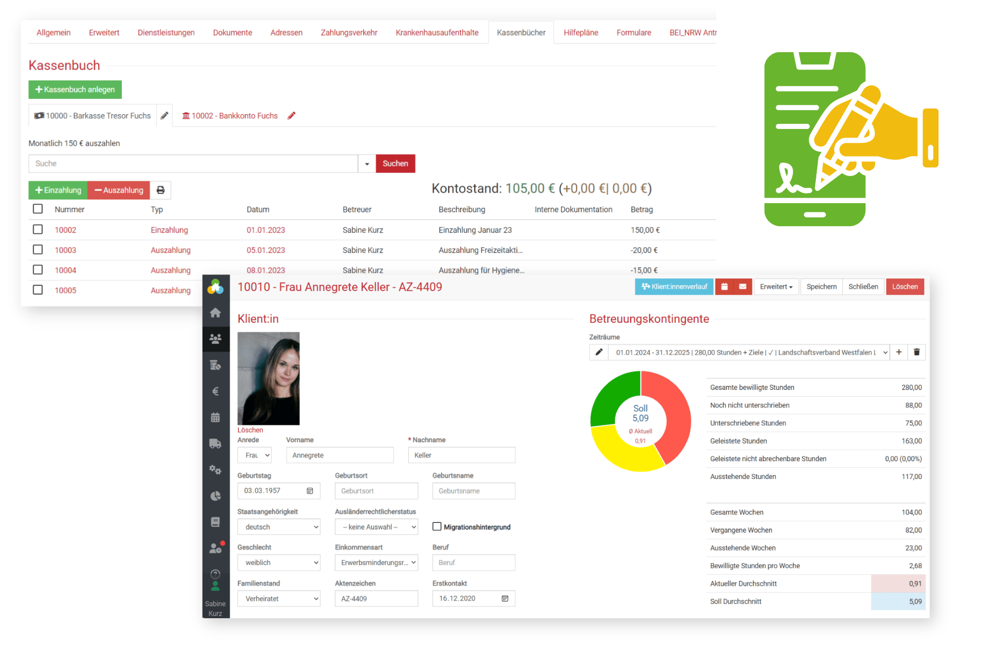 Stammdaten, Abwesenheiten und Dokumente deiner Klient:innen werden zentral erfasst – inklusive Funktionen zum Hochladen und Erstellen von Formularen oder Briefen. Ergänzend verwaltest du Bargeld- und Kontobestände bequem über digitale Kassenbücher: Ein- und Auszahlungen sowie Kassenbelege jederzeit im Blick.