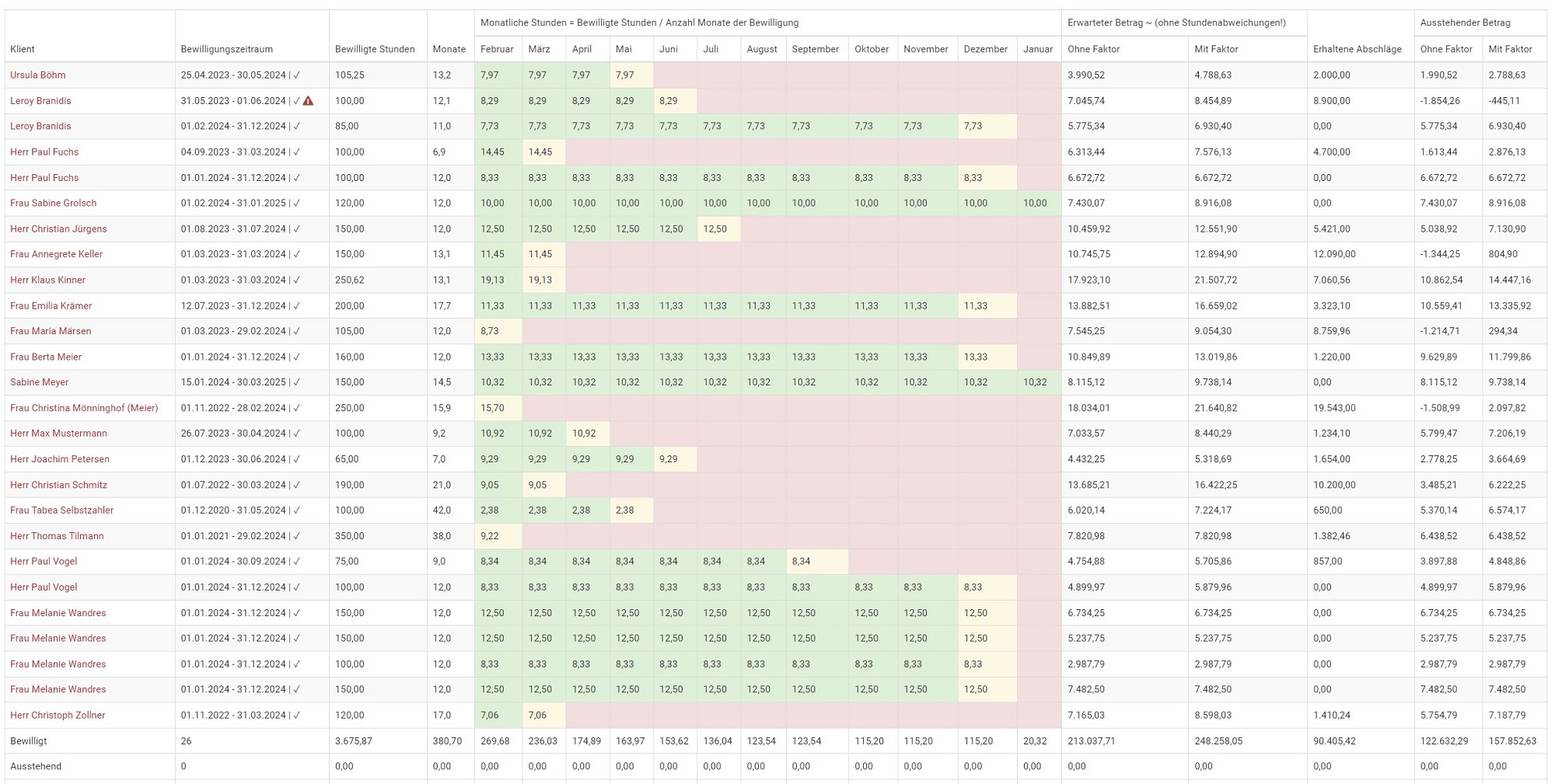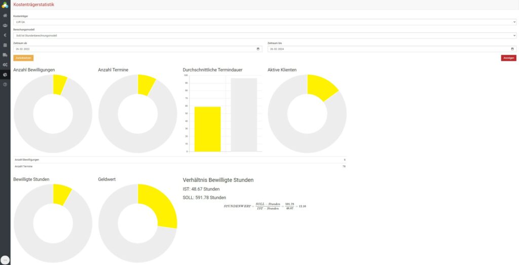 Mit den Bewilligungsstatistiken behalten Sie den Cashflow des Unternehmens immer im Auge. Es werden Ihnen alle aktiven Bewilligungen mit zu leistenden Stunden pro Monat angezeigt, sowie welche Zeiträume bald auslaufen.