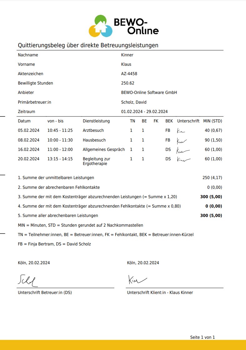 Entscheiden Sie ganz flexibel, ob Sie beispielsweise nach 2 oder 4 Wochen eine Gesamtquittierung für alle Leistungen einholen, welche bei Klient:innen in diesem Zeitraum geleistet worden sind.