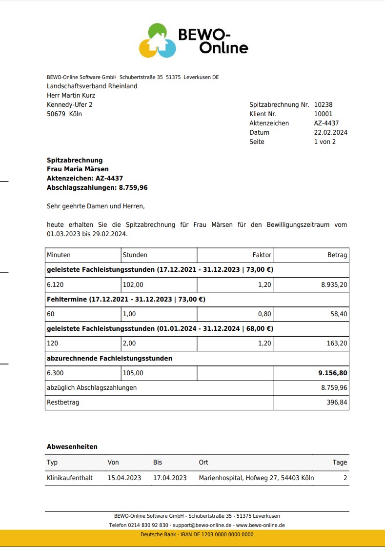 Mit somedo lassen sich gängige Abrechnungsmodalitäten im LVR-Gebiet wie Spitzabrechnungen erstellen. Dabei kann das Layout individuell gestaltet werden, sodass beispielsweise die Gruppenangebote, Fehlkontakte, Klinikaufenthalte und monatliche AVIS-Abschläge auf der Spitzabrechnung dargestellt werden.