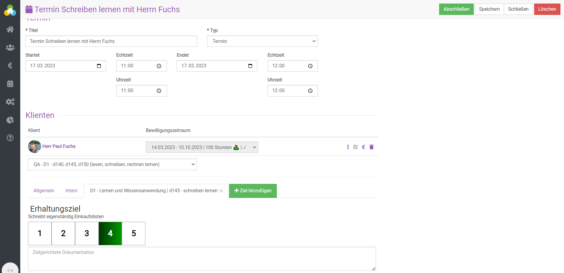 Es lassen sich Erhaltungs- oder Veränderungsziele definieren, welche im Rahmen der Zielüberprüfung nach jeder einzelnen Leistungserfassung bewertet werden können. In der Terminübersicht lässt sich dann nach Zielen und Bewertungen filtern, um Zwischenziele zu überprüfen.