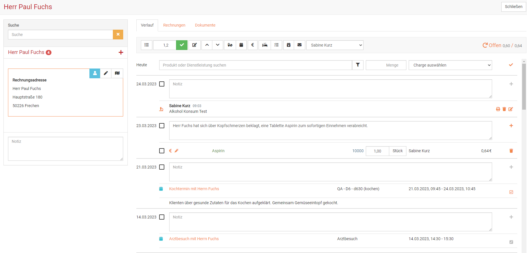 Die Verlaufsdokumentation hilft Ihnen im Rahmen des Klientenverlaufes dabei, Termine und Schichten Ihrer Klient:innen chronologisch mit Dokumentationen zu versehen. Im Verlauf lassen sich auch Vorlagen oder Tests anlegen und die Medikamentenabgabe kann verwaltet werden.