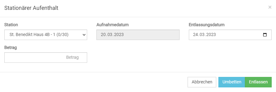 Im Reiter für den Klientenverlauf können Sie ebenfalls die Stationsverwaltung für Ihre Klient:innen unternehmen. Hier können Sie eine:n Klient:in einer Station zuordnen, umbetten oder auch wieder entlassen. Dies wirkt sich automatisch auf die Belegung der Stationen aus.