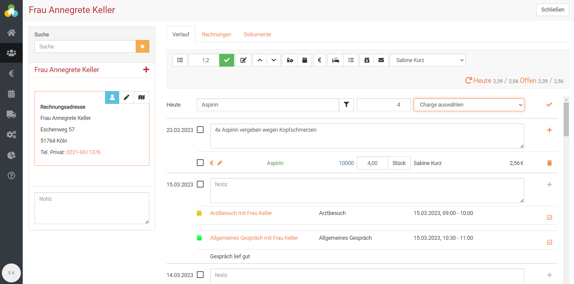 Im Klientenverlauf von Ihren Klient:innen kann die Medikamentenabgabe gesteuert werden. Dafür wählen Sie das Produkt, die Menge und die Charge aus und komplettieren die Dokumentation über das Notizfeld. Der Warenbestand wird hiermit automatisch angepasst und der Vorgang ist in den Warenbewegungen festgehalten. Über entsprechende Symbole kann das Datum oder die Art der Verabreichung ebenso angepasst werden. Die Funktion der Vorlagen im Klientenverlauf hilft Ihnen dabei, regelmäßige Dosierungen als Vorlage anzulegen, sodass der Arbeitsprozess nochmals vereinfacht wird.