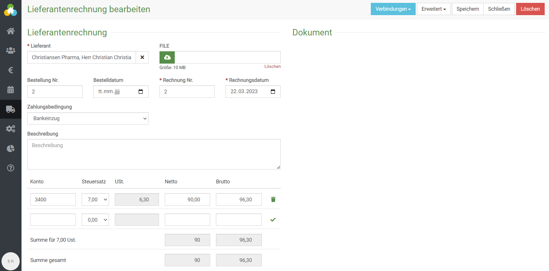 Nachdem eine Lieferung angelegt wurde, lässt sich daraus direkt eine Lieferantenrechnung erstellen. Dort kann nun ein eingescanntes Dokument hochgeladen sowie wichtige Informationen für die Buchhaltung hinterlegt werden. Die Rechnung erscheint auch direkt in der Akte des entsprechenden Lieferanten.
