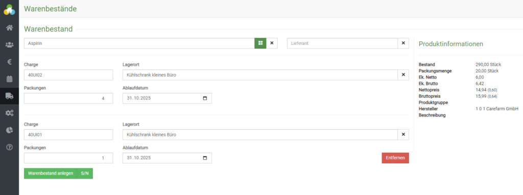 Nach einer Lieferung können Medikamente direkt als Warenstand angelegt und gebucht werden. Dabei können die Packungen nach den individuellen Chargennummer unterteilt und Lagerorten hinzugefügt werden. Ebenfalls kann hinterlegt werden, wer auf diese Lagerorte Zugriff haben darf. Die gesamte Übersicht des Warenbestandes oder der Warenbewegungen wird Ihnen in der Software angezeigt, sodass Sie diesen auch als PDF-Übersicht herunterladen und ausdrucken können.